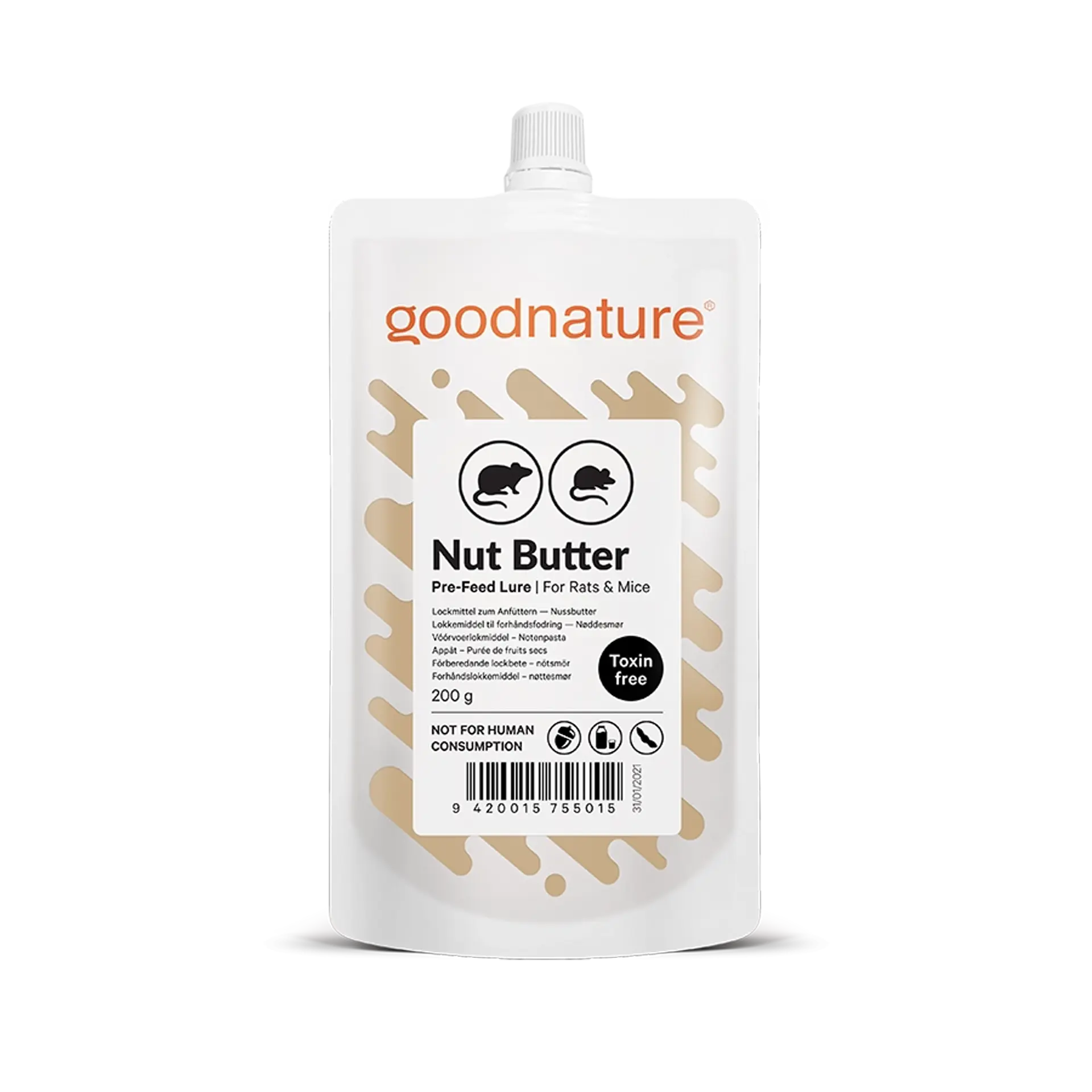L'appât de pré-alimentation Goodnature® encourage les rats et les souris à se diriger vers votre piège plutôt que vers des sources de nourriture concurrentes. Cela rend votre piège irrésistible lorsque les rats ou les souris viennent l'inspecter. Nos appâts ne contiennent pas de poison, il n'y a donc pas de risque d'empoisonnement secondaire.