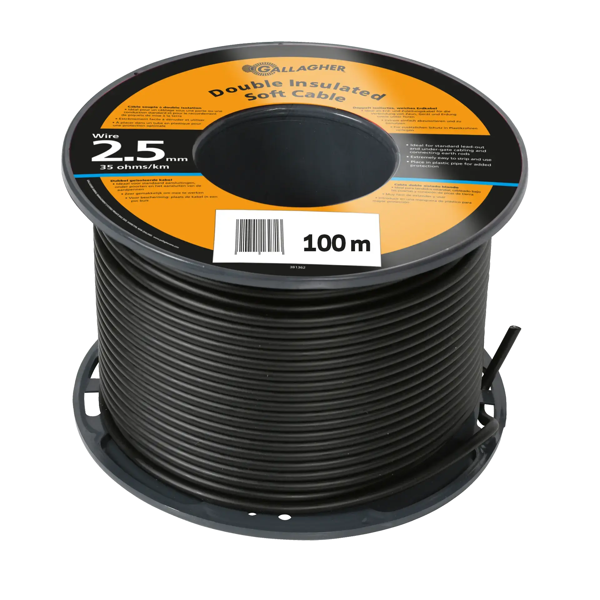 Câble doublement isolé avec indicateur de distance tous les mètres pour raccordement entre électrificateurs et clôtures, ou câblages souterrains (portes). Noyau de câble galvanisé évitant toute oxydation. Ø 2,5 mm, convient pour des distances supérieures à 25m.