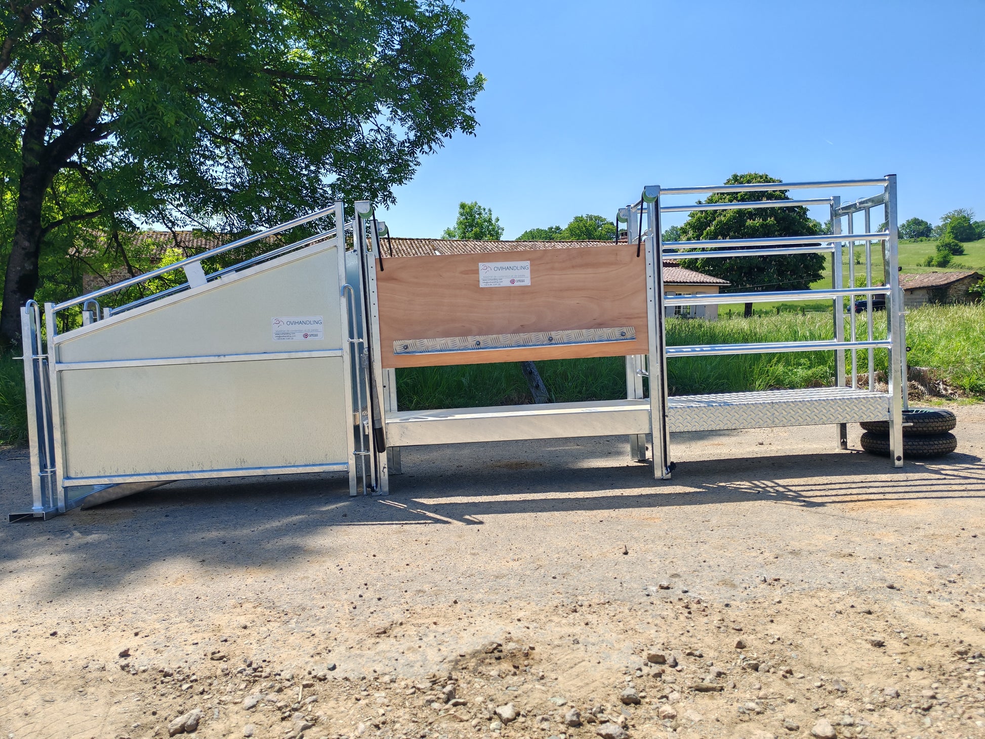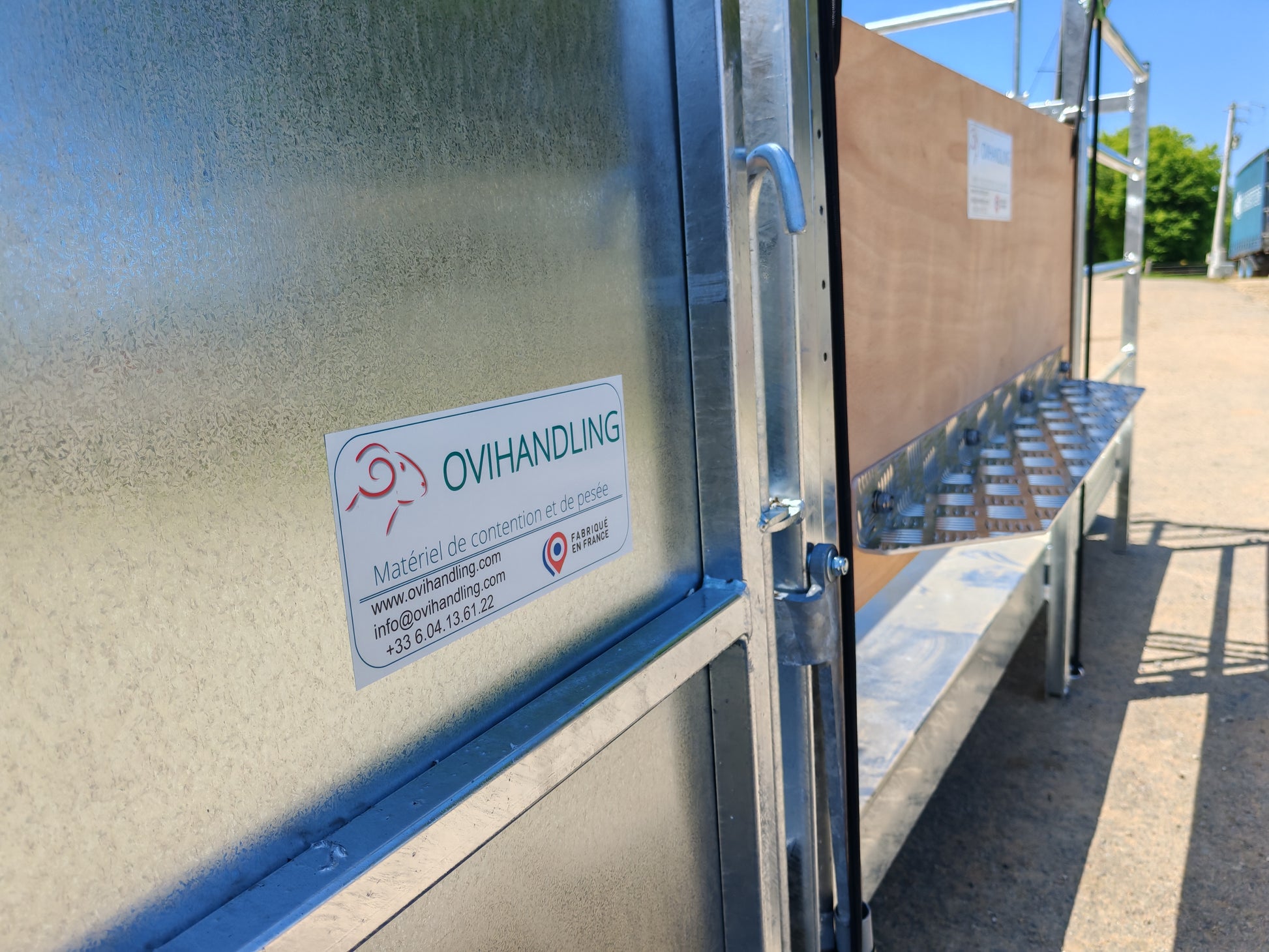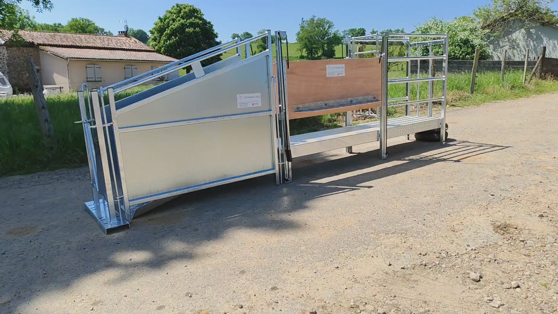 Le couloir est equipé d'une cage d'attirance équiper d'un cornadis pour placer 1 brebis enfin de facilité la monté des animaux, un pont pour monter dans le couloir ainsi que des claies en biais, pour mieux accopmagner les brebis sur le côté.