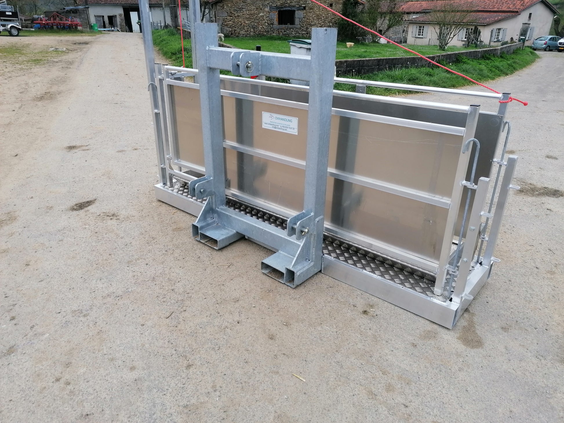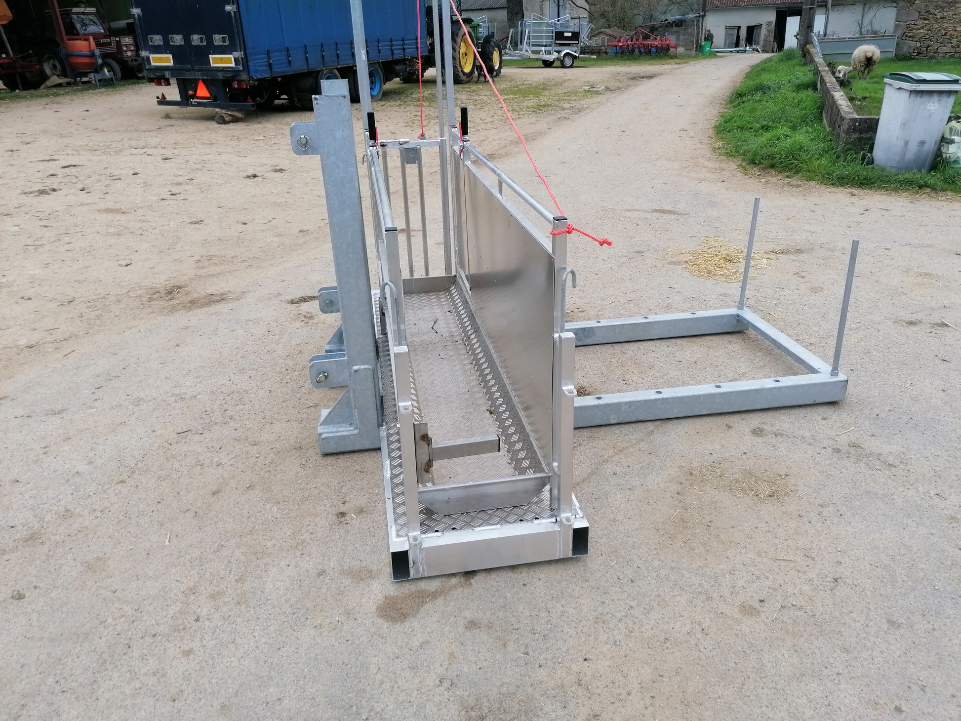 Le tracto parc peut se deplacer par le biais de l'attelage 3 point de votre tracteur ou grâce au fourche de palette. Il est composé d'un chassis lourd acier avec une galvanisation à chaud, ainsi qu'un fond de couloir surélevé en aluminium enfin de travailler à hauteur.
